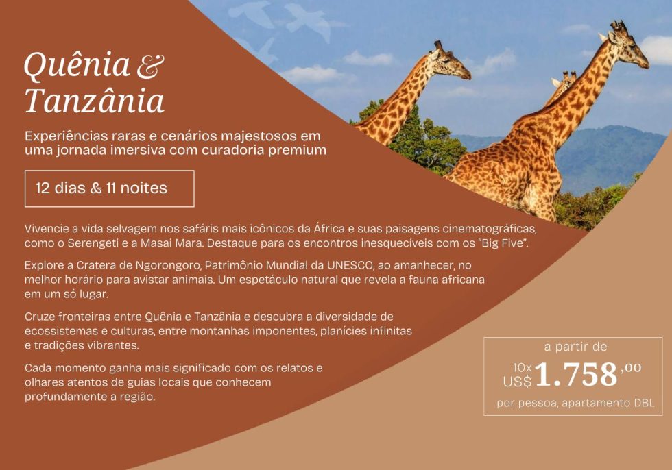 Uma imersão numa das maiores rotas de migração de animais do planeta. Com total conforto e segurança. A grandiosidade da vida selvagem é o foco principal nessa jornada. As vastas savanas, preenchidas com a movimentação de migrações de gnus e zebras, oferecem um espetáculo natural impressionante. O Serengeti é um destino onde cada dia revela novas surpresas e a beleza selvagem se apresenta em toda sua plenitude.