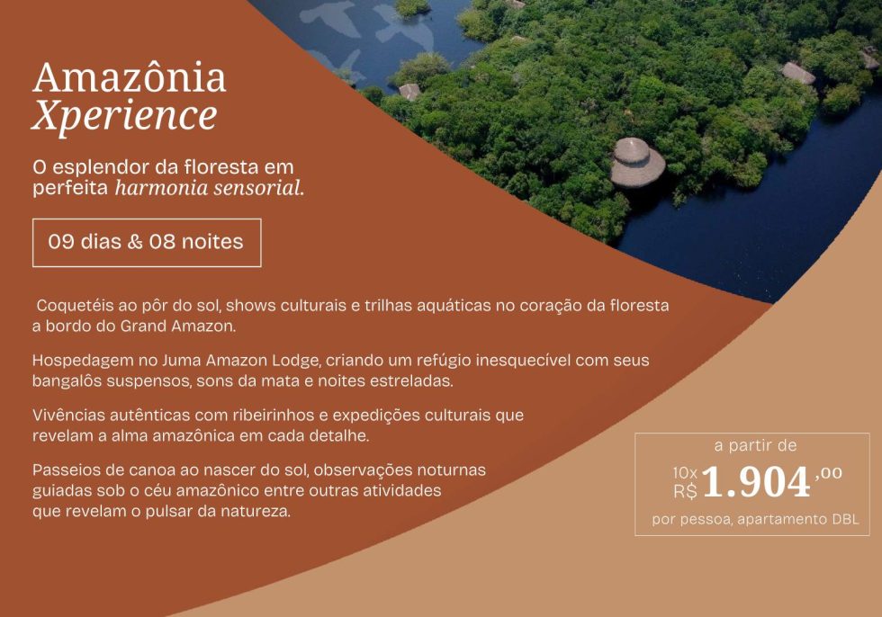 Uma imersão única na Amazônia, com paisagens grandiosas, cultura vibrante e natureza intacta. O roteiro une o charme do Grand Amazon, o aconchego do Juma Lodge, encontros com comunidades locais, passeios ao amanhecer e noites sob um céu estrelado que revelam a alma amazônica em sua forma mais pura.