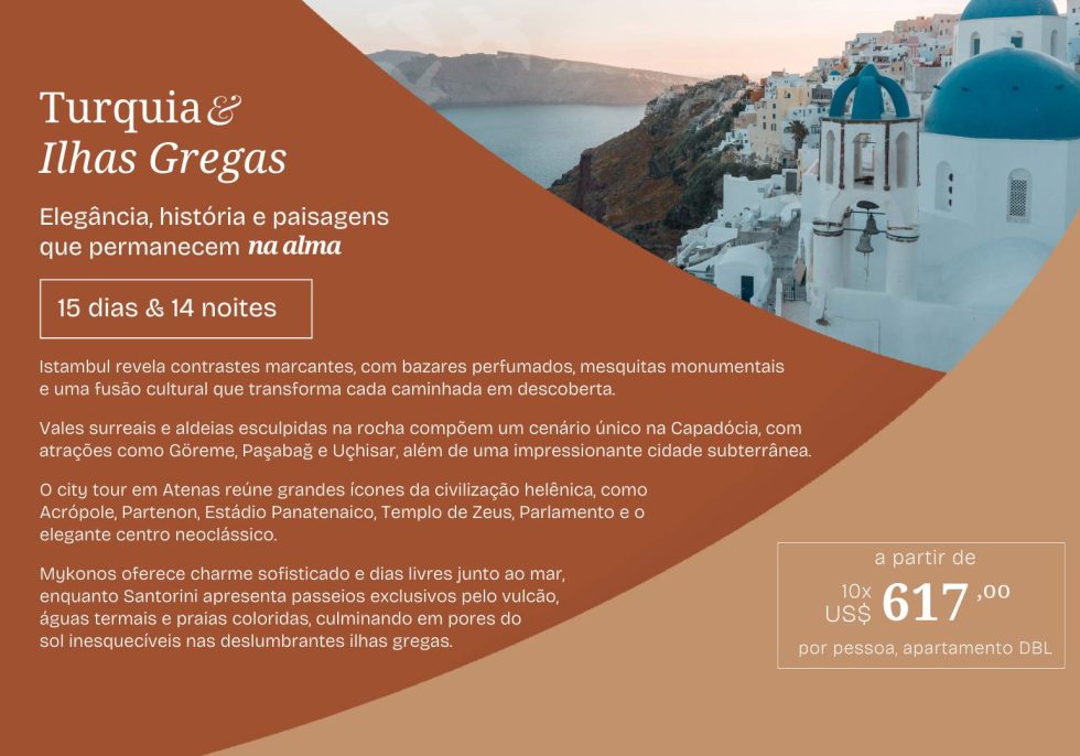 Uma viagem refinada entre Turquia e Grécia que une a energia de Istambul, os cenários surreais da Capadócia e a herança clássica de Atenas. O roteiro segue para Mykonos e Santorini, onde o charme do Egeu, experiências exclusivas e pores do sol inesquecíveis completam uma jornada verdadeiramente extraordinária.